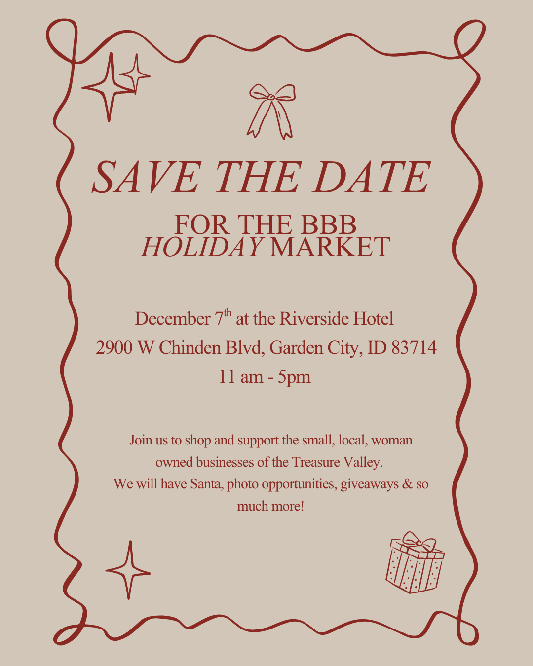 BBB Holiday Market 2025 Sunday, December 7, 2025 11:00 AM 5:00 PM 11:00 17:00 Riverside Hotel 2900 West Chinden Boulevard Boise, ID, 83714 United States (map) Google Calendar ICS Date & TimeSunday, Dec 7, 2025 | 11am–5pmLocationRiverside Hotel2900 W Chinden Blvd, Garden City, ID 83714CostFree